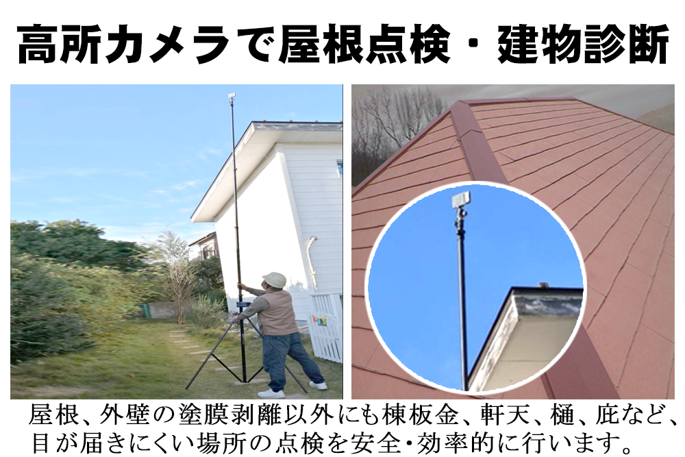 ・はしごや足場、高所作業車を使用せず、地上から屋根の状況を お客様と一緒に確認する事ができます。 ・ドローン撮影では確認しずらい軒天や破風板箇所などの至近撮影が可能です。